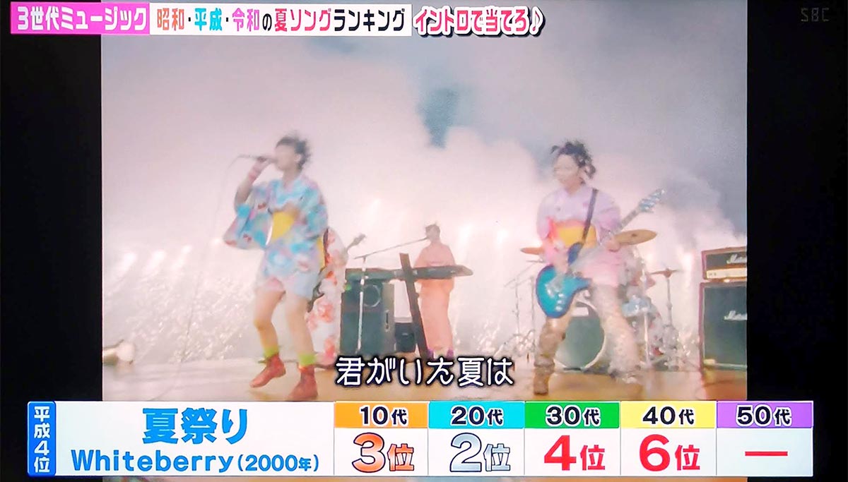 だから、平成の夏ソングとしては Whiteberry でいいけど、昭和の夏ソングとしては JITTERIN’JINN の『夏祭り』を入れてくれー、と思ったら、JITTERIN’JINN のも平成だった……(平成2年)。 てっきり昭和かと……。